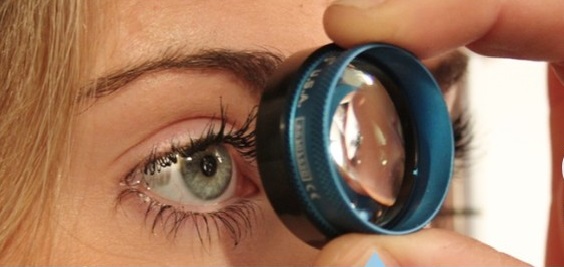 em geral lupa simples é suficiente. A iluminação entra "de lado", uns 30 graus do plano do rosto, para fazer sombras, evidenciando a profundidade dos sinais. Olhar com o olho contralateral para não ficar com o rosto na frente da pessoa que está sendo examinada.